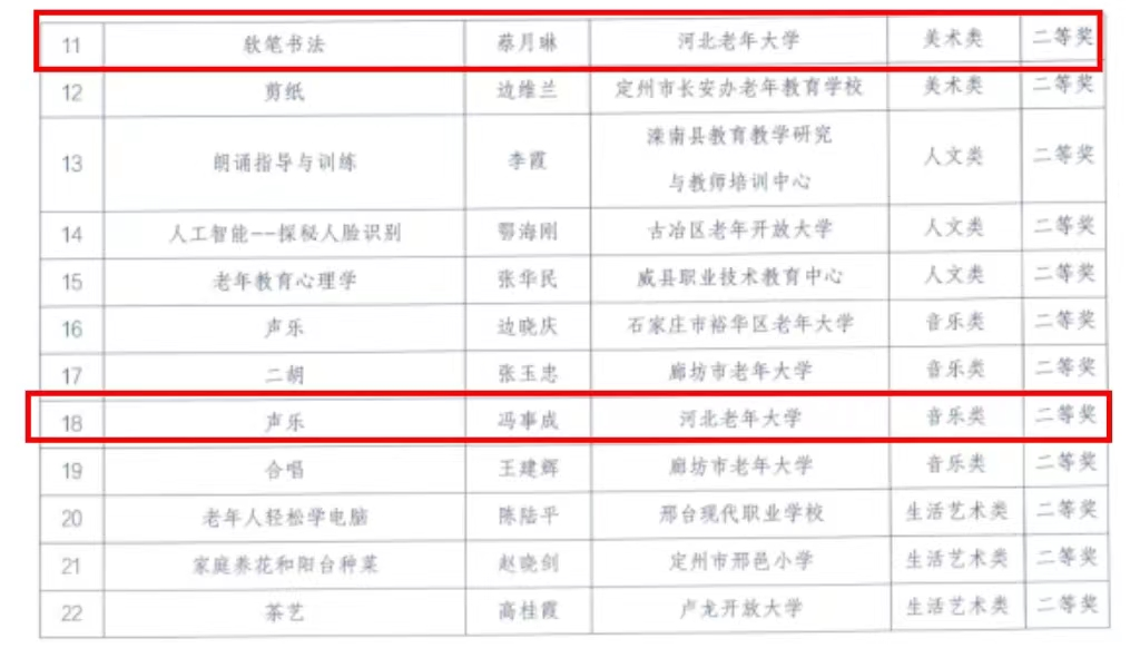 近日,由河北省教育厅组织的2023年河北省老年教育优质课评选结果公示,我校选送的《老年实用英语》《玩转智能手机》课程荣获2023年度河北省老年教育优质课一等奖,《软笔书法》《声乐》课程荣获2023年度河北省老年教育优质课二等奖。