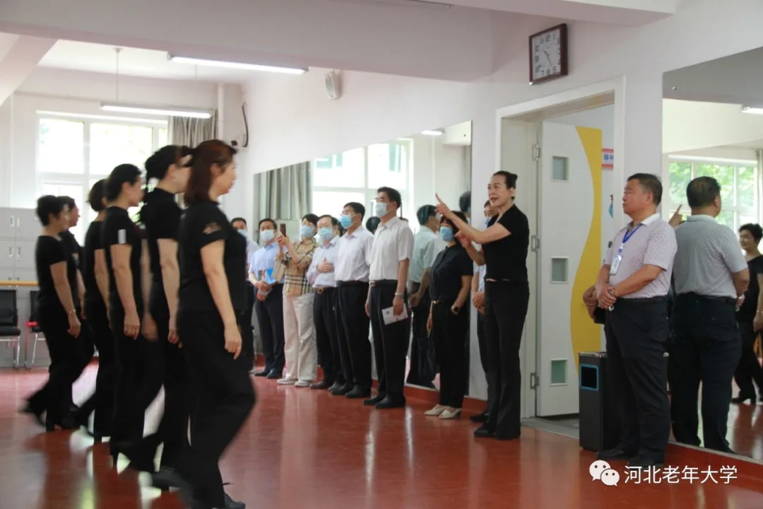 王红勇一行沿着学校下沉广场栈道边走边看,对我校幽静雅致的校园环境赞不绝口。在教学楼,一行人依次参观了声乐班、书法班、舞蹈班、器乐班现场教学,观看了部分学员的精彩教学展示。优雅安静的校园环境、丰富多彩的课程和学员们精彩的展示表演给调研组留下了深刻印象,展示了河北老年教育的成绩与风采。