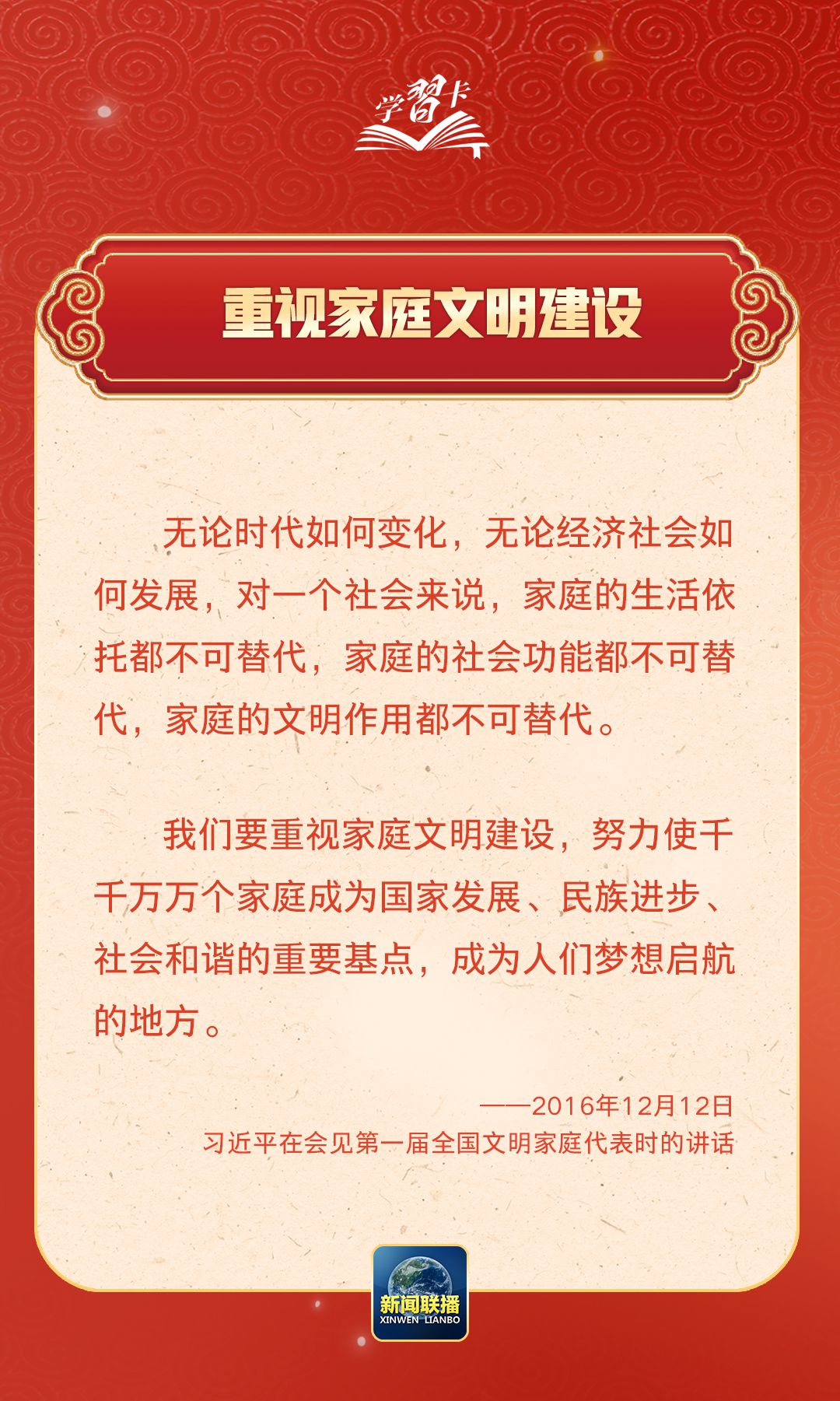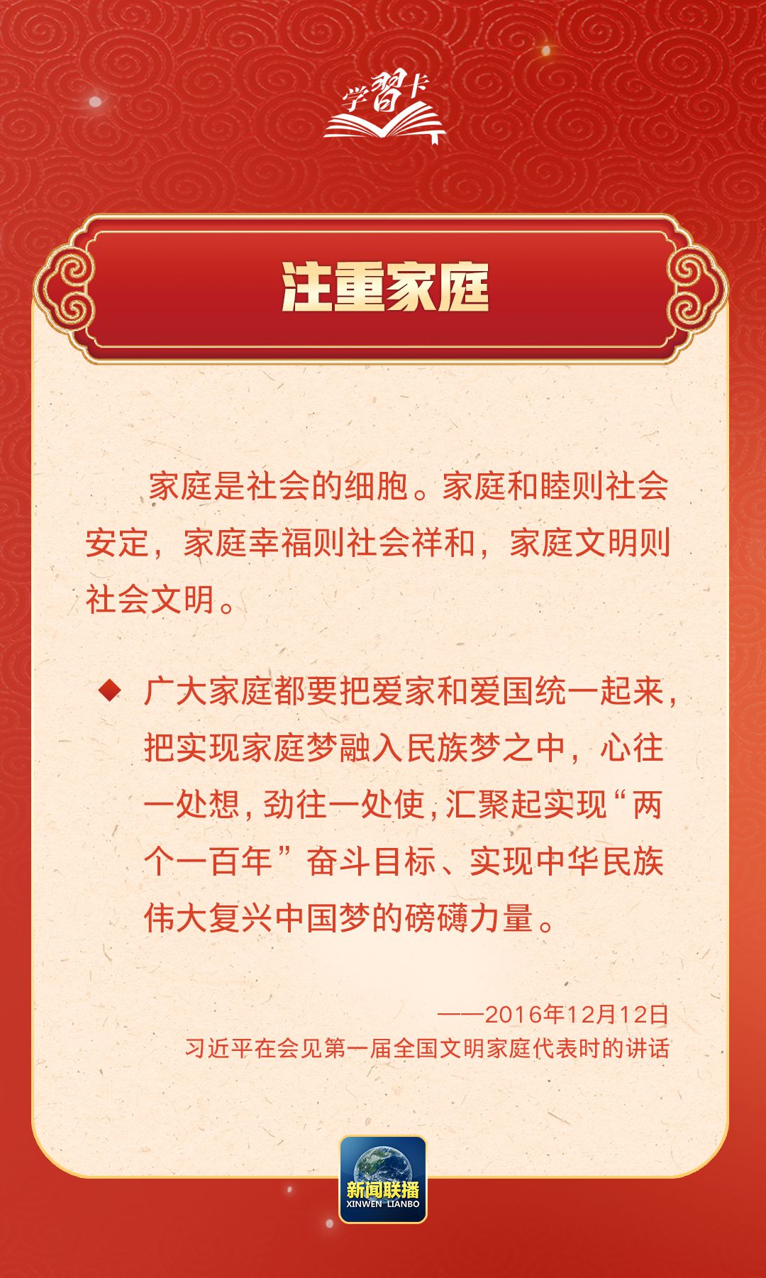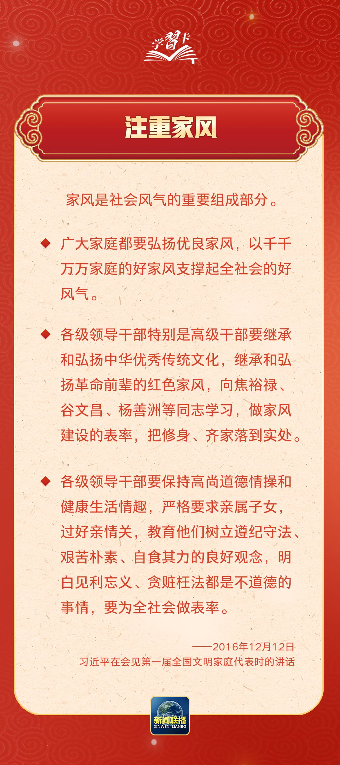 在习近平总书记心中,家国的分量很重。他多次强调要重视家庭建设,提倡爱家爱国相统一,指出广大家庭都要弘扬优良家风,以千千万万家庭的好家风支撑起全社会的好风气。近日,《求是》杂志发表习近平总书记重要文章《注重家庭,注重家教,注重家风》,一起学习↓