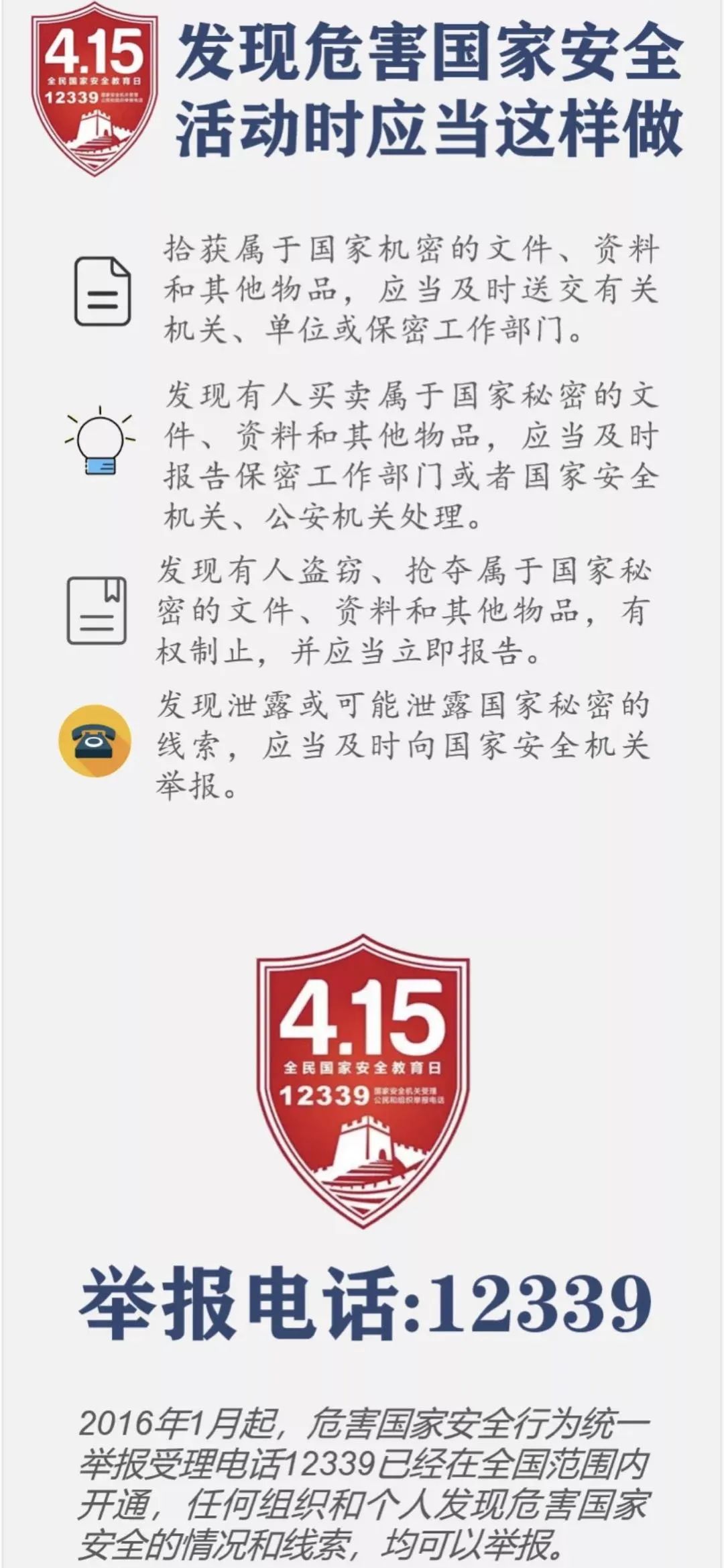 2015年7月1日,全国人大常委会通过的《中华人民共和国国家安全法》第十四条规定,每年4月15日为全民国家安全教育日。